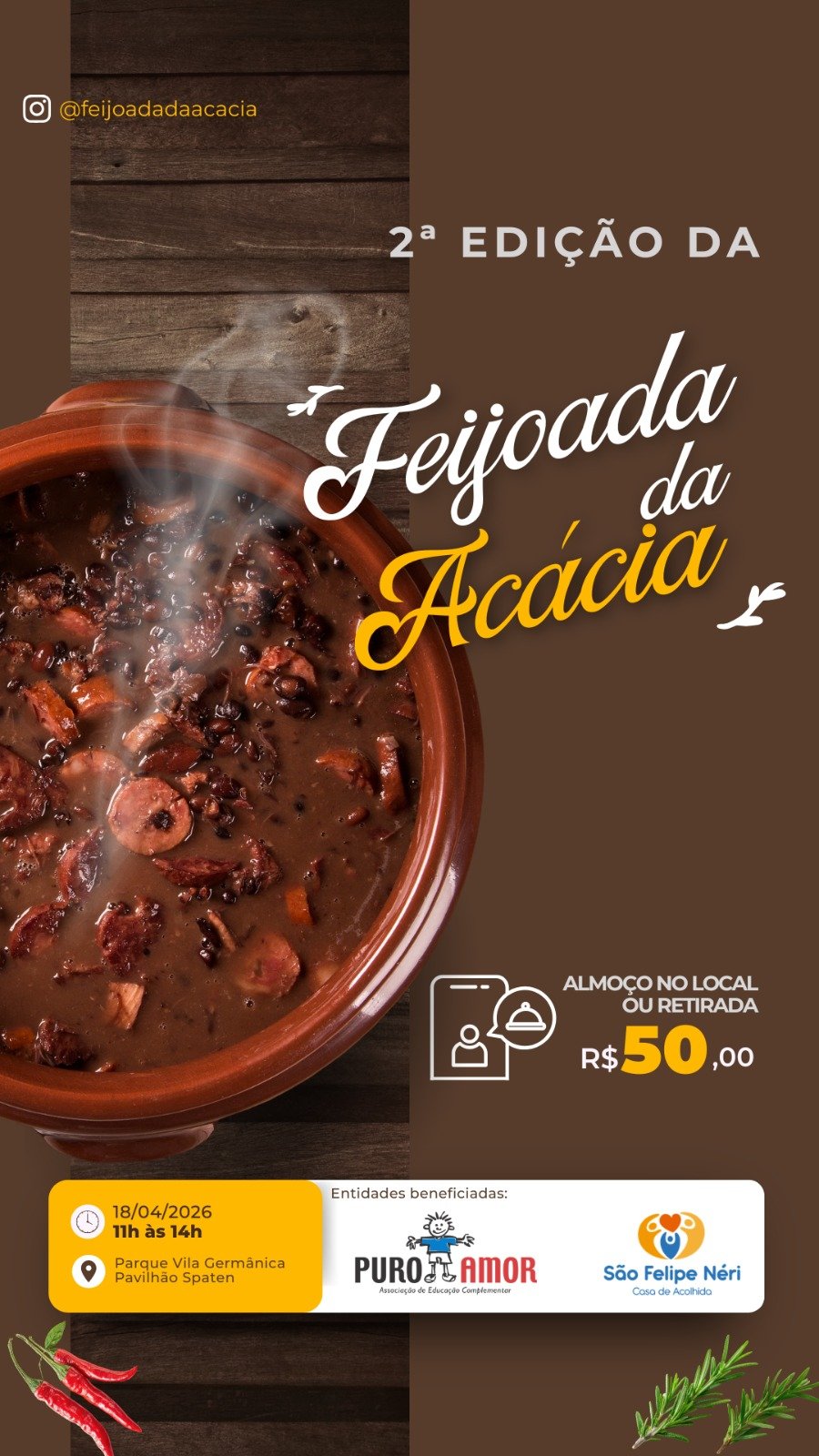 No dia 18 de abril de 2026, a 2.ª Feijoada da Acácia será realizada no Parque Vila Germânica – Setor Spaten, em Blumenau, com a meta de reunir 2.000 pessoas. O evento consolida-se como uma das principais ações solidárias da região.