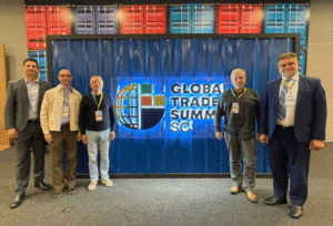 Na foto : Da esquerda para a direita: Sandro Marin, Alfredo Pinto, Altair Slomsky, Jorge Irineu Hosang e Rogério Marin, membros do Sinditrade, durante o Global Trade Summit 2025, em Balneário Camboriú.