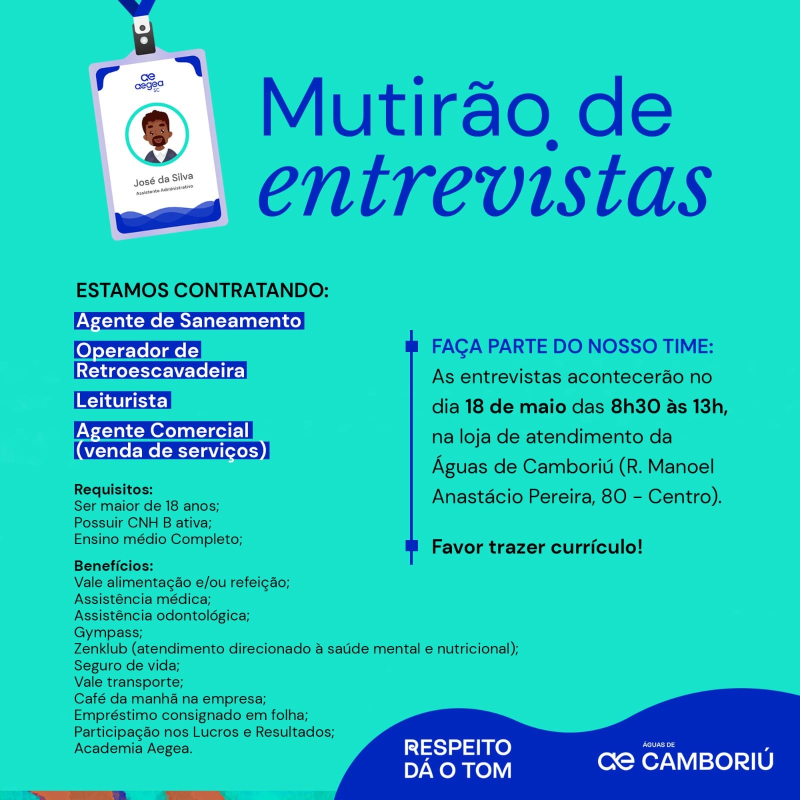 Procurando uma oportunidade no mercado de trabalho? Sábado, 18 de maio, é dia de mutirão de entrevistas na Águas de Camboriú. São diversas vagas em diferentes setores da empresa: agente de saneamento, operador de retroescavadeira, leiturista e agente comercial são alguns exemplos. As entrevistas acontecem entre as 8h30min e 13h, na sede da empresa, na Rua Manoel Anastácio Pereira, 80, Centro.