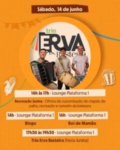 17h30 às 19h30 – Trio Erva Rasteira (forró). Local: Lounge Plataforma 1.