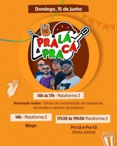 14h às 17h – Recreação Junina – Oficina de customização de chapéu de palha, recreação e camarim da belezura. Local: Lounge Plataforma 1.