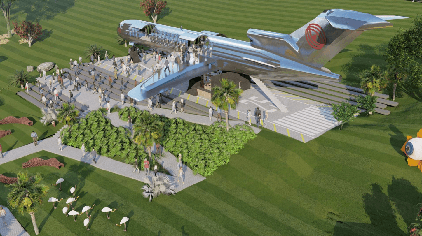 Seguem imagens do projeto 3D e uma imagem do avião já no Surreal Park. Os créditos das imagens do projeto 3D são para Acervo Surreal / 8B Arquitetura e do avião para Acervo Surreal.