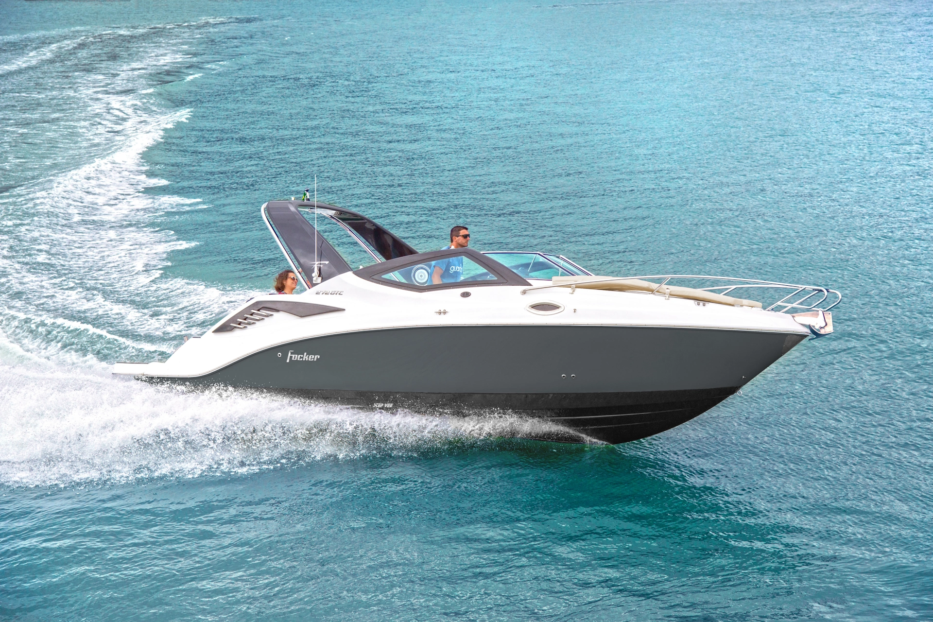 Focker 270, da Fibrafort: A lancha Focker 270, de 27 pés, comporta até 10 pessoas durante o dia e 2 para pernoite. O design privilegia a convivência a bordo, com plataforma de popa ampla, banco rebatível que vira solário ou proa, e acabamento em fibra reforçada com acabamento interno amadeirado. É opção de entrada para quem busca o primeiro barco com cabine confortável e lazer em família, a partir de R$ 530.000,00.