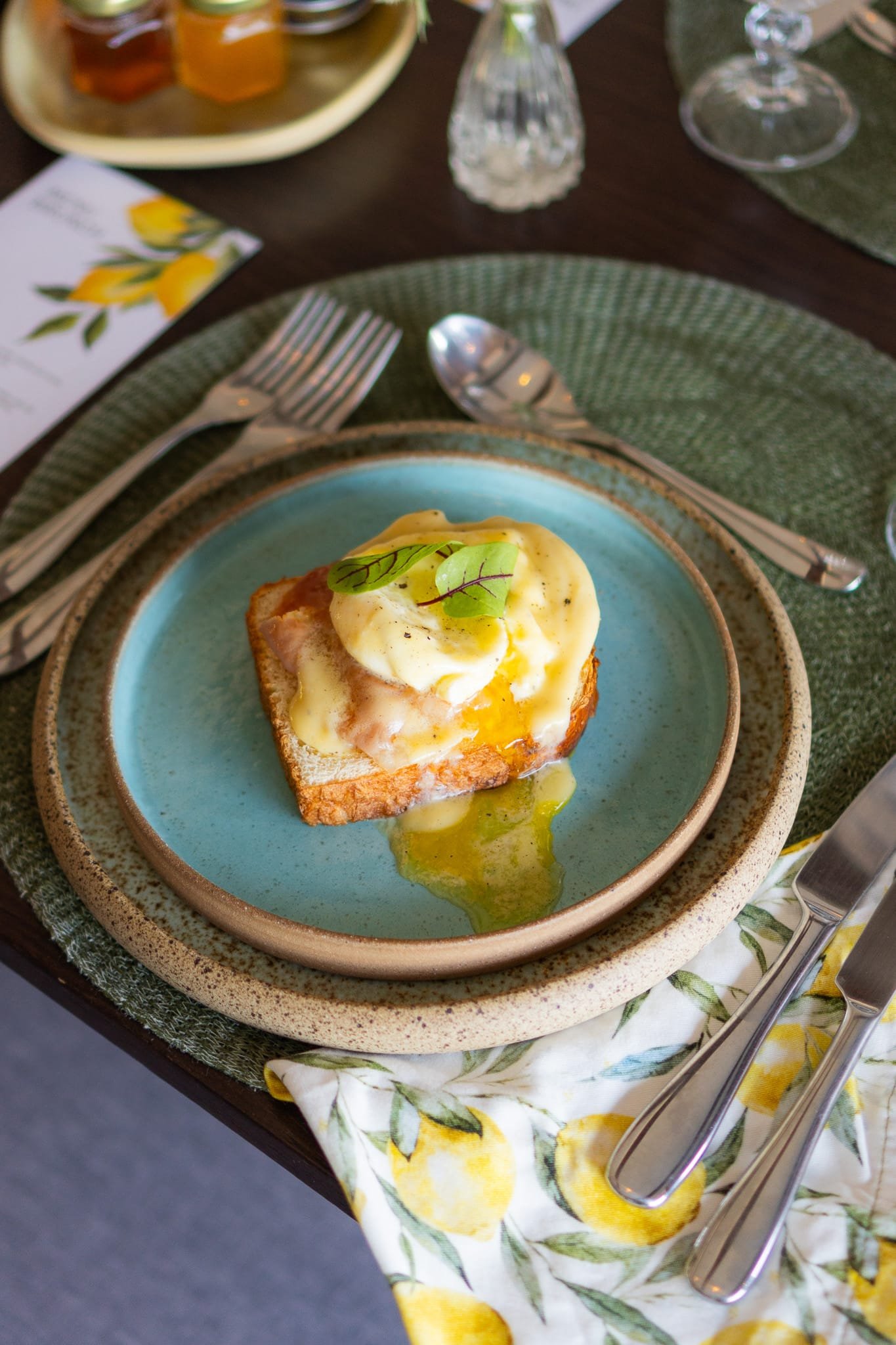 Servido à mesa, o brunch começa com uma seleção de entradas com pães artesanais (ciabatta, sourdough, croissant e pão de leite), acompanhados de geleia de frutas vermelhas, manteiga, requeijão, mel e frutas frescas. O primeiro passo também inclui sucos do dia, café filtrado, chás e espumante para brinde.