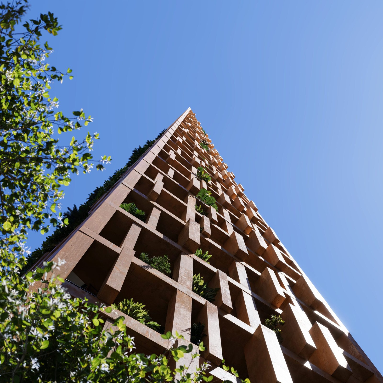 Para garantir a saúde respiratória dos moradores, o Auris incorpora filtros de ar de alta eficiência e sensores e detectores de CO² instalados em ambientes fechados e até nas garagens. Isso assegura a renovação e a pureza do ar interno. O conceito de “edifício-árvore” usa o paisagismo funcional e espécies nativas para integrar a natureza à fachada, seguindo a tendência da biofilia.