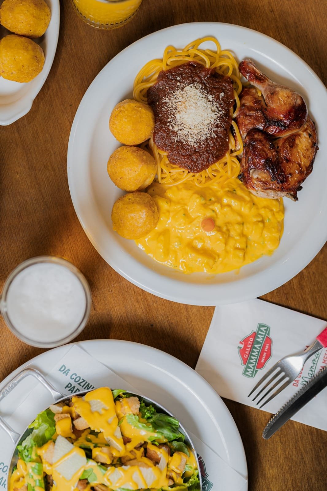 Entre as opções, estão o galeto assado na brasa com tempero exclusivo, massas frescas com molhos variados, polenta frita crocante, salada de radicci com bacon e a clássica sopa de capeletti. O radicci, inclusive, é orgânico e cultivado nas terras da família Cavichioni, que pertenceram ao avô paterno do fundador da rede, Julinho Cavichioni. As sobremesas — como pudim de leite e sagu — e bebidas como vinho em taça e chopp completam a experiência.