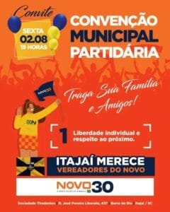 O Novo Itajaí realizará sua primeira convenção na próxima sexta-feira (02), às 19h, na Sociedade Tiradentes. Marcando um momento histórico para o partido e com uma nominata completa de 12 homens e 6 mulheres, o evento tem como objetivo apresentar os candidatos comprometidos com a mudança e o progresso da cidade. A população é convidada a participar e conhecer os nomes que representarão o Novo Itajaí nas eleições municipais.
