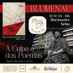 No próximo sábado, 7, acontece o encontro com o poeta Ricardo Corrêa, autor do livro recém lançado, “A Culpa é dos Poemas”, no Rocinante Sebo, em Blumenau. O evento visa a divulgação da obra, onde o autor irá fazer um bate-papo com os visitantes sobre o seu processo criativo, leitura de poemas e autógrafos.No livro, o autor explora, em 3 atos, as dualidades do ser, os confrontos de sentimentos, amores, encontros, desencontros, vida, morte e os dilemas da nossa existência através da poesia.A obra foi contemplada pelo edital Meu Primeiro Livro da Fundação Cultural de Itajaí, publicada pela editora Rizoma de Itajaí e está com o segundo lançamento marcado para dia 11/12, na cidade natal do autor, Lages, na serra catarinense.Agende-se:Lançamento do Livro “A Culpa é dos Poemas” de Ricardo CorrêaSábado, 7 de dezembro – 10h00min Local: Sebo Rocinante Endereço: R. Arnoldo Ruediger, 159 – Água Verde, Blumenau – SC